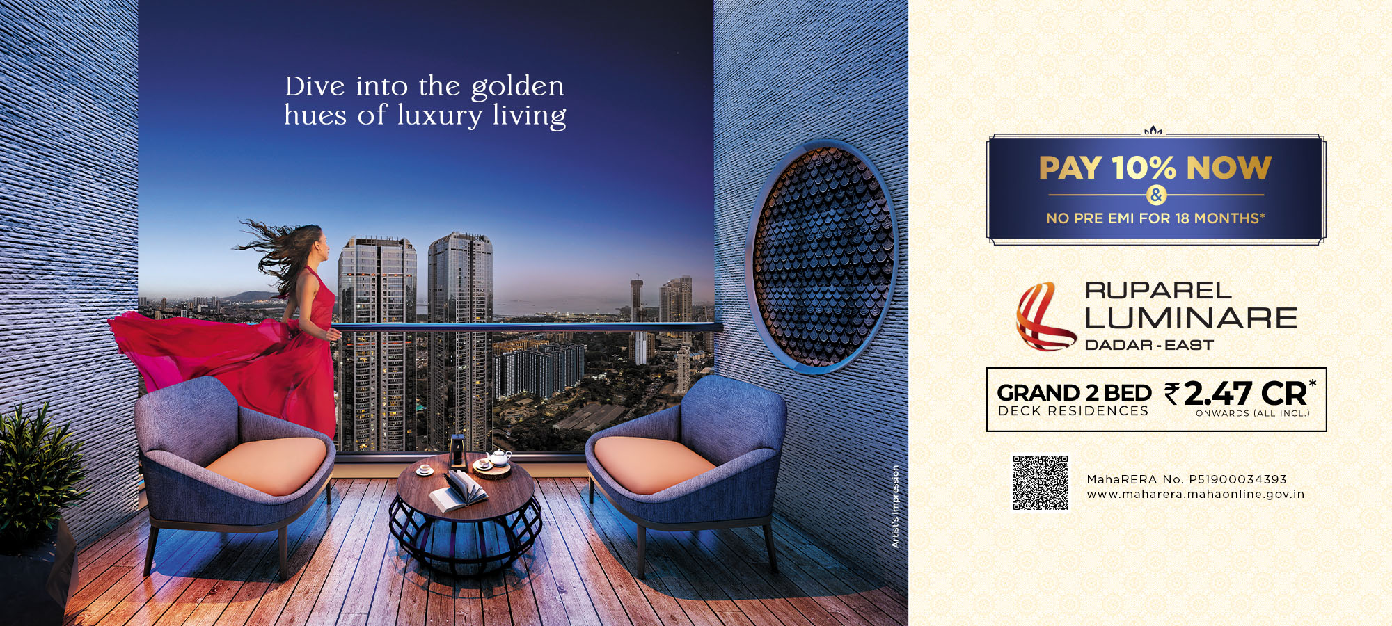 DISCLAIMER - The project has been registered with Maharashtra Real Estate Regulatory Authority as "Ruparel Luminare" with MahaRERA Registration No P51900034393. and is available on the website - maharera.mahaonline.gov.in - https://maharera.mahaonline.gov.in This document does not constitute any form of an offer and/or agreement and all purchases/leases shall solely be governed by the terms and conditions of the agreement for sales/lease. All brands may be replaced by an equivalent or better brand, as decided by the project architect. All images and footages are for representative purpose unless otherwise noted. T&C Apply.